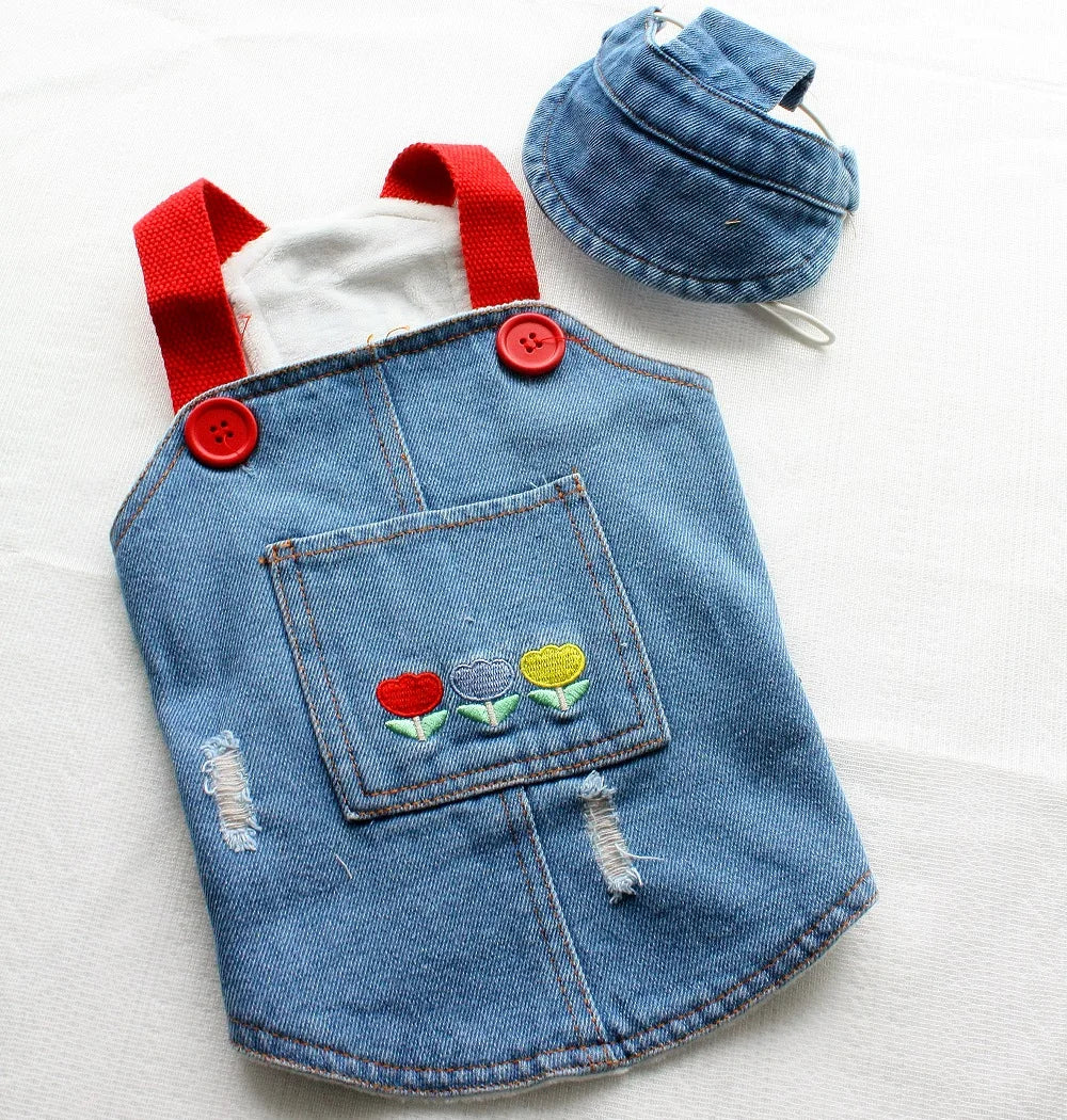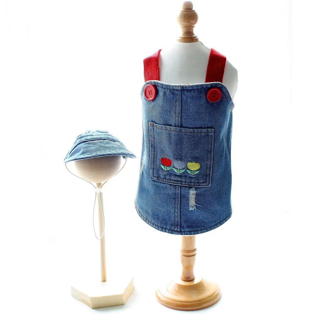 Cute Denim Dog Dress with Embroidered Flowers and Hat Fashionable Pet Outfit Summer Walks Outdoor Adventures