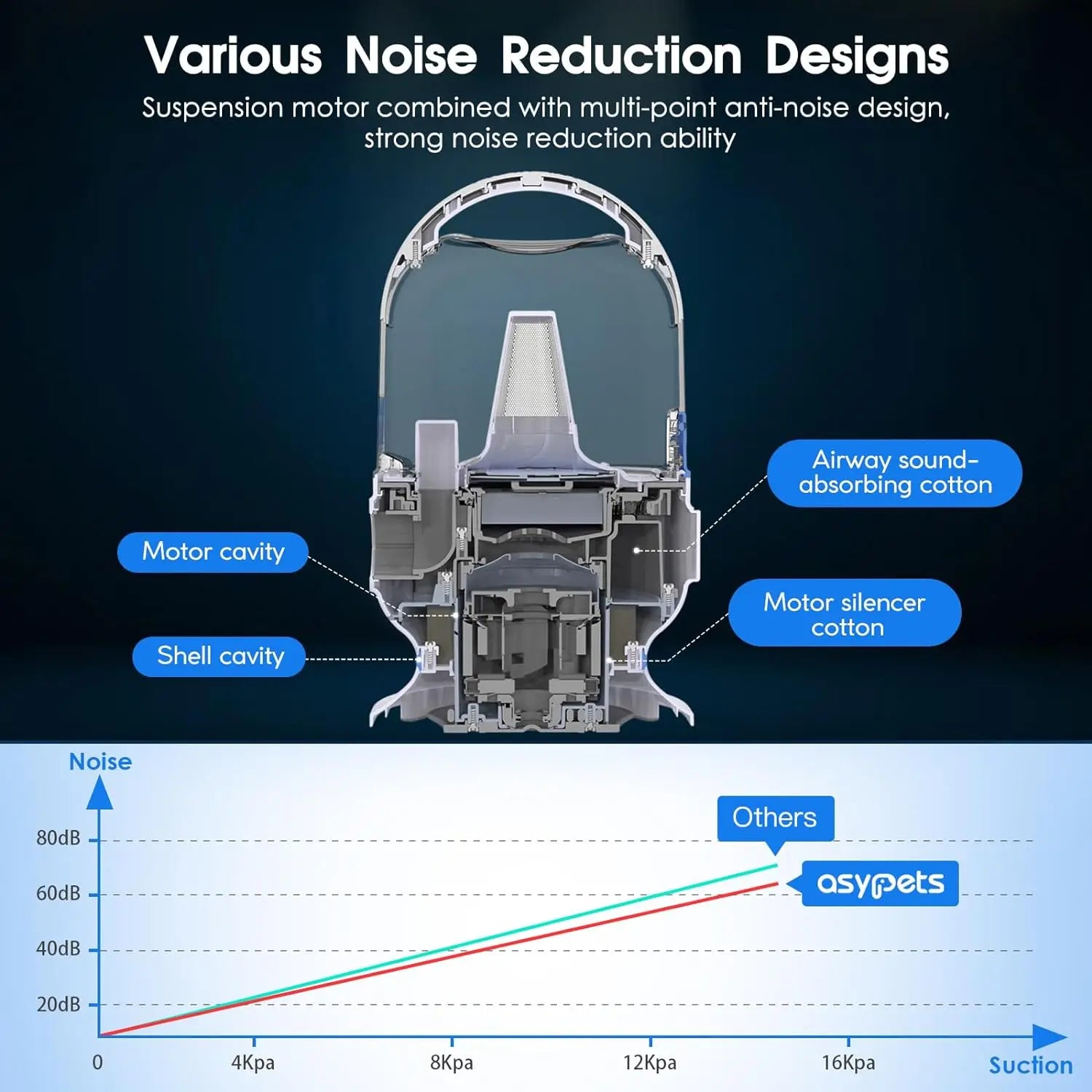 【16 levels of suction adjustment】 AsyPets pet groomer has a super suction of 13.4Kpa, which is divided into 16 gears for adjustment, and can collect 99% of pet hair into the vacuum container.