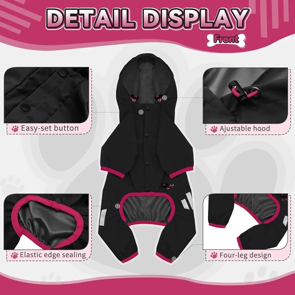 Fashion-design - Our dog rain coats adopt four-leg design, prevent water from all directions. Hidden traction mouth makes it convenient to connect the colla and leash. Legs tail adopt elastic wrap design, neck waist are designed with drawstring for adjustment.